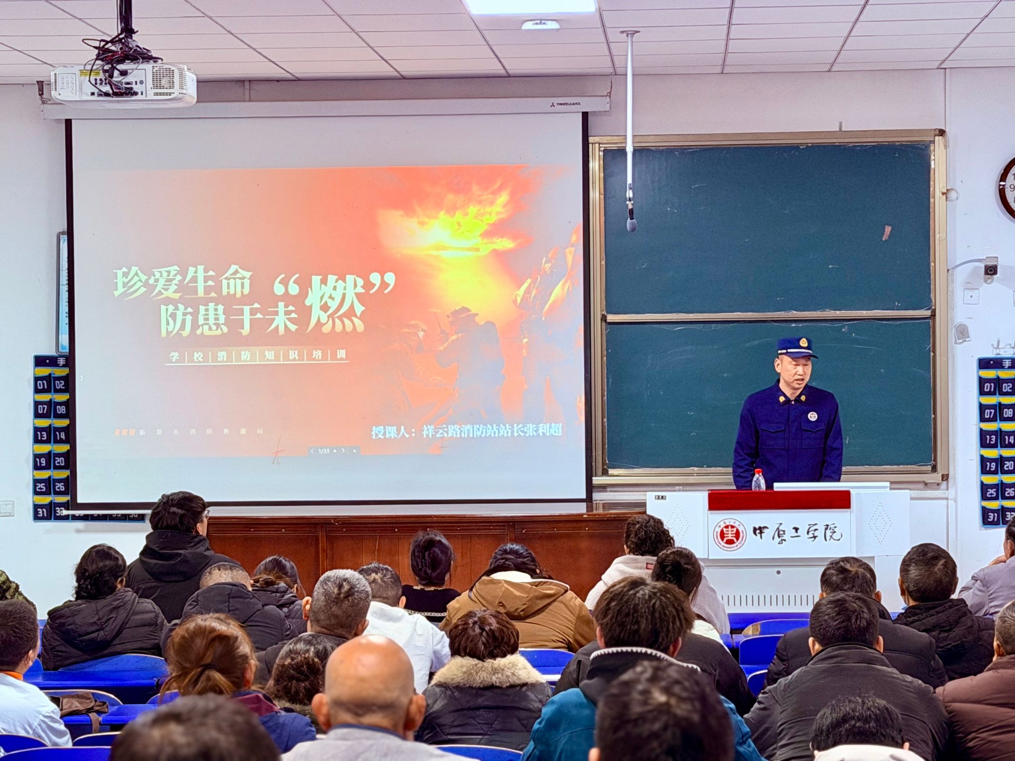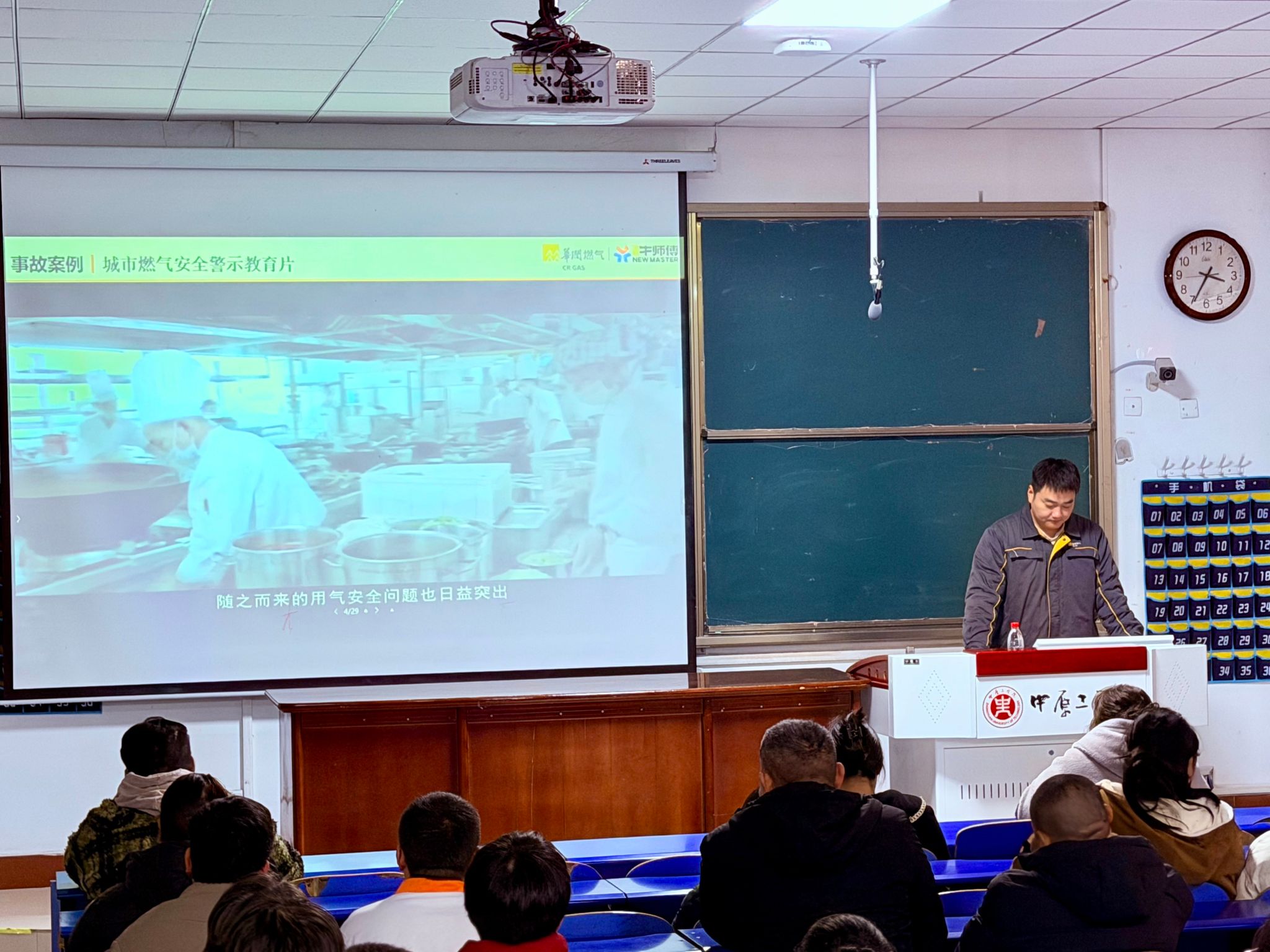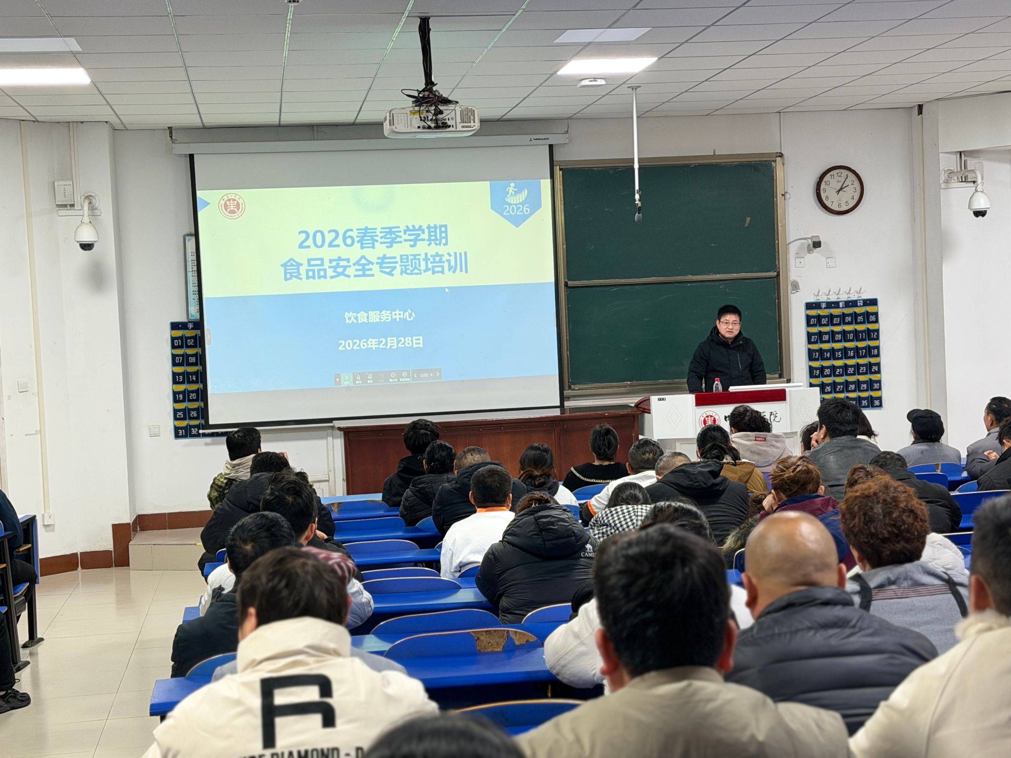 2026年2月28日,饮食服务中心在龙湖校区4号教学楼101教室召开2026年春季学期食堂从业人员培训会。华润燃气、消防救援、上海译数科技及食堂管理等部门依次进行专业授课,食堂服务从业人员200余人参加培训。
